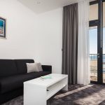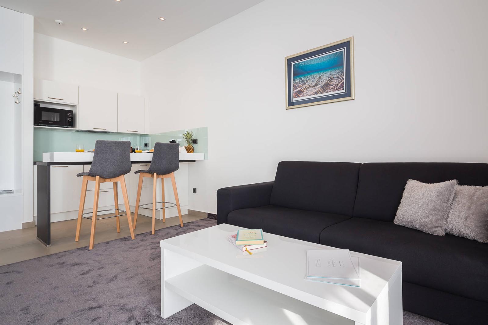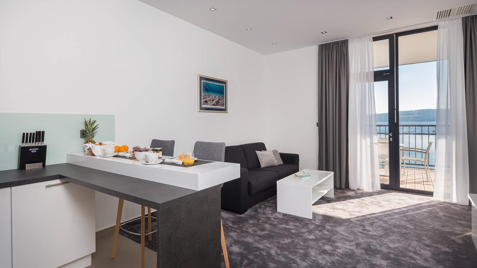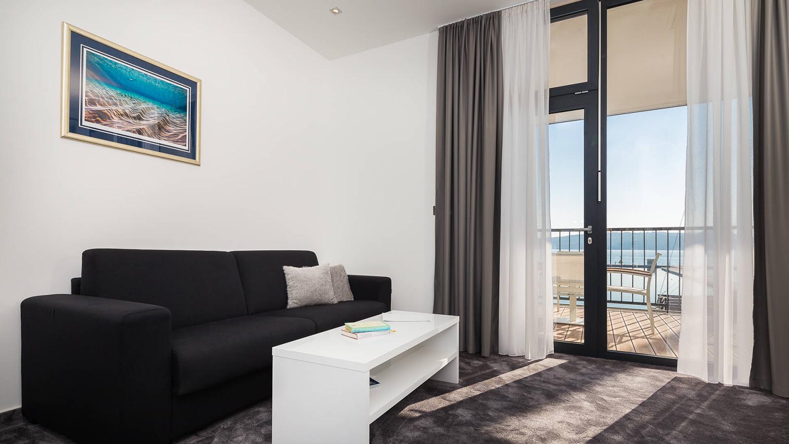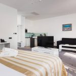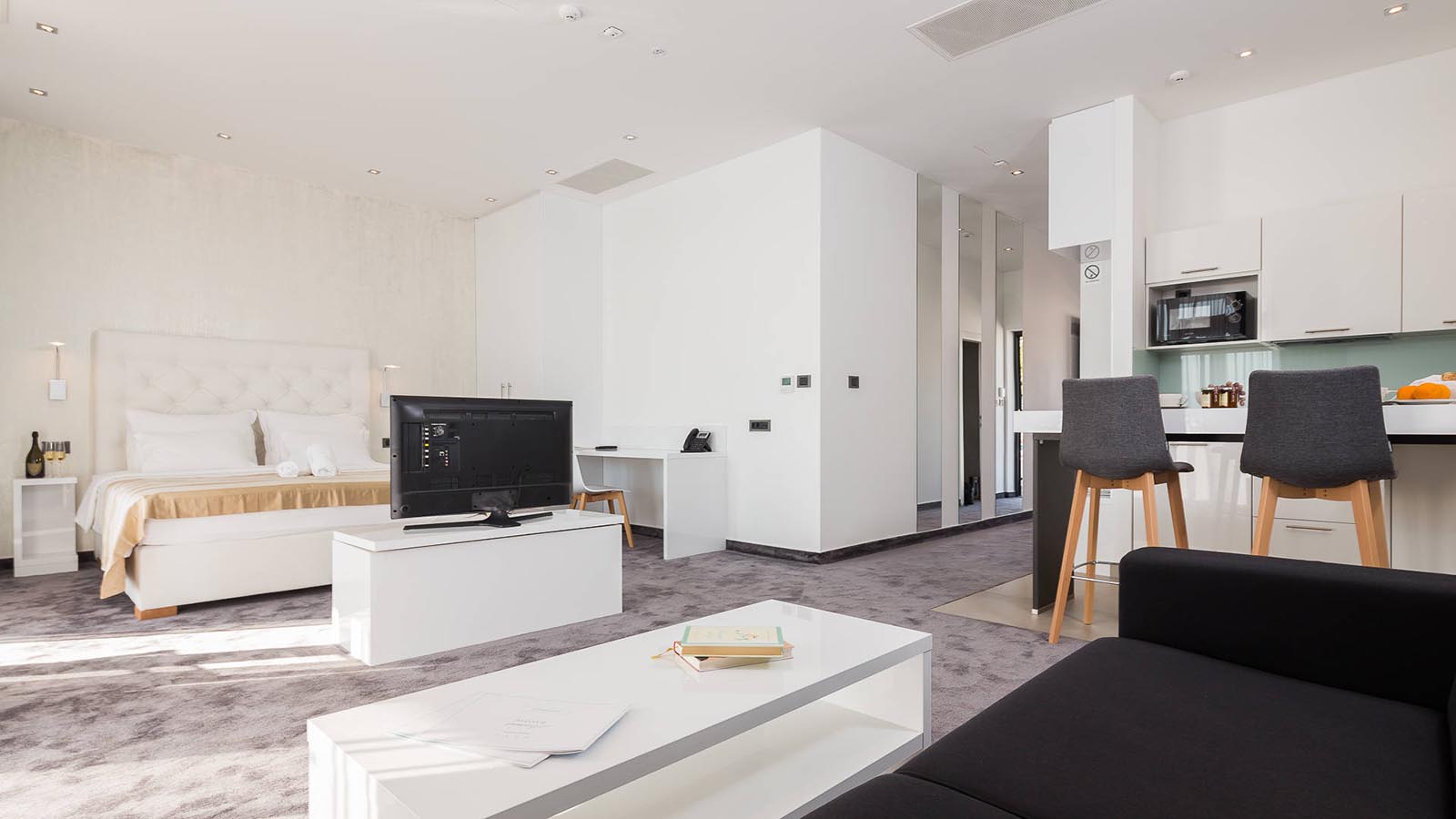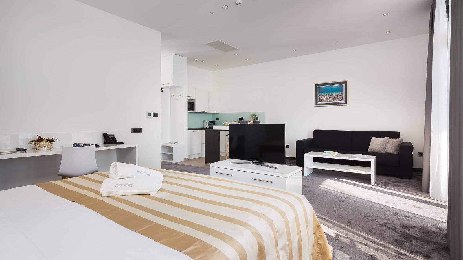 Spavaća soba s King Size krevetom, jedna kupaonica s toaletom i tuš kabinom. Uključena kuhinja, prostor za blagovanje, te dnevni boravak s kaučem na razvlačenje, klima uređajem, balkonom i ležaljkama za sunčanje.